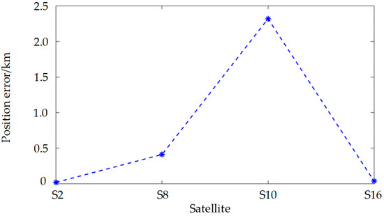 As previously noted, the observation point is capable of simultaneously detecting 18 satellites. Nonetheless, for the purposes of this analysis, it is posited that only one of these 18 satellites is observable at any given moment. Consequently, the four satellites exhibiting the highest elevation angles are chosen for positioning. These satellites, in descending order of elevation, are identified as S2, S16, S8, and S10. Figure 9 illustrates the positioning errors associated with these four satellites over the duration of the observation period. The data indicate that satellite S2 incurs the least positioning error, whereas satellite S10 experiences the greatest error. This finding aligns with the conclusions drawn in the third section of this study. It is thus recommended that, when selecting a satellite for positioning, preference be given to those with higher elevation angles.