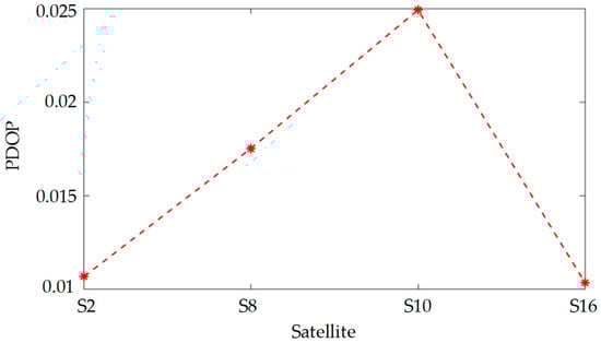 Figure 10 presents the PDOP for a single satellite, which quantifies the variability in the satellite’s spatial orientation. A higher degree of variability corresponds to a lower PDOP value, signifying improved positioning precision. In Figure 10, it is evident that the PDOP values for satellites S2 and S16 are the lowest, suggesting that these satellites exhibit the most substantial positional fluctuations within the observable timeframe. As depicted in Figure 9, the positioning precision of satellites S2 and S16 surpasses that of satellites S8 and S10. Consequently, when observing a single satellite, it is advisable to select one that demonstrates significant positional changes during the observation period to achieve more accurate positioning.