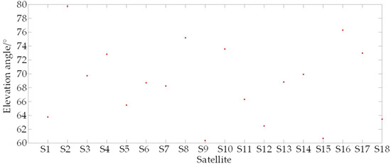 From Figure 3, it can be seen that, after the satellite is determined, the change in reflects the change in ; that is, the smaller the , the larger the . Therefore, the impact of satellite elevation on positioning accuracy can be obtained by analyzing the impact of changes in on the positioning accuracy. The larger the elevation , the better the positioning accuracy.