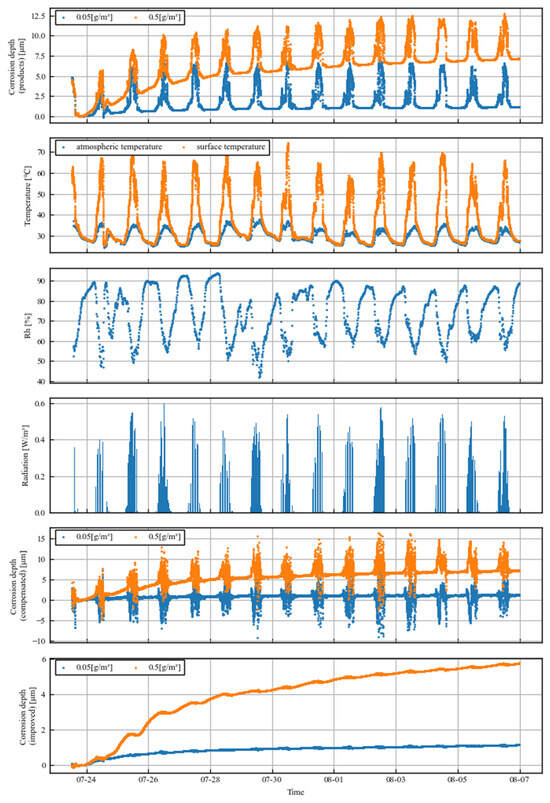 Figure 3 shows the corrosion depths measured by the product sensors over two weeks, as well as the respective variations in air temperature, sensor surface temperature, relative humidity, and solar radiation in the first four rows. The temperature of the sensor part was more likely to be higher because the reference part was covered by a coating. During the day, the surface temperature of the sensor was almost 20 °C higher than the air temperature. At this time, the temperature of the reference part was not as high because of the covering. This resulted in a relatively low electrical resistance of the sensor section and a spike error in the corrosion loss during the day. This means that product sensors can only be used in environments without daylight or in the long term.