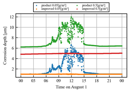 The detailed data focusing on one day for both sensors are shown in Figure 4 (specifically, the data are from 1 August, the 12th day of observation). From around 5:00 to 7:00, the corrosion depth measured by the product sensor gradually increases in relation to that measured by the improved sensor. After a large and obvious error, the data of the product sensor gradually converge to match the improved sensor data from around 15:00 to 18:00. Because corrosion is a phenomenon in which the corrosion depth increases monotonically, this gradual divergence is an error of the product sensor.