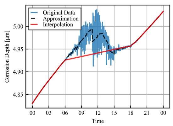 Here, the threshold of variance is set to be 10−6. For the periods judged not to be low error, the gradient of the approximation line is taken as the hourly corrosion rate. The data for the periods determined to be high error are then linearly approximated from the endpoints of low error periods. The results of this process are plotted as red lines in Figure 5. In periods with a high measurement accuracy, the approximate line is almost identical to the original data, while in periods with large errors, the corrosion rate is interpolated by linear approximation into a form from which it can be extracted. This enables the hourly corrosion rate to be obtained even in sections with large errors during the daytime.