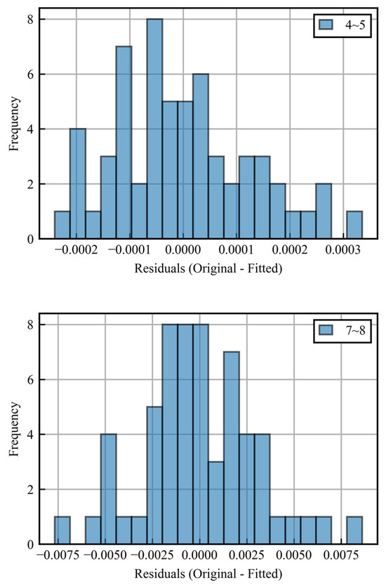 First, as shown by the black dotted line in the figure, the data are divided into hourly intervals, and a linear approximation is made for each period. The variance is then calculated for the difference between the original data (blue) and the approximation (black), and intervals with variance above a given threshold are determined to be error periods. Figure 6 shows histograms of the differences between the approximation and the original data from 4:00 to 5:00 and 7:00 to 8:00 as examples.