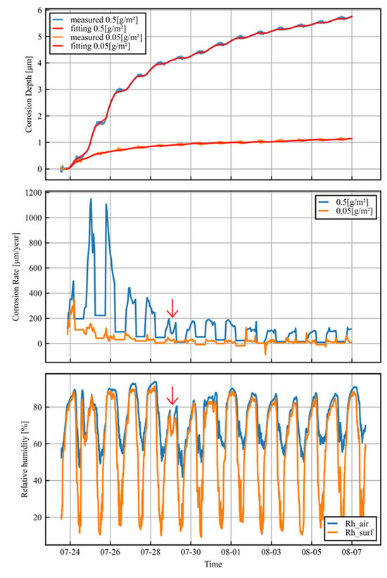 The relative humidity of the air and the relative humidity of the sensor surface are shown in the lower panel of Figure 7. Relative humidity is an important parameter because electrolytes form on metal surfaces because of the deliquescence of deposited salts. The relative humidity of the sensor surface is the parameter that effectively affects corrosion, as the temperature of the metal surface differs significantly from the air temperature because of solar radiation [20]. The relative humidity of the sensor surface was calculated from the air temperature, the relative humidity of the air, and the sensor surface temperature using the following equations: