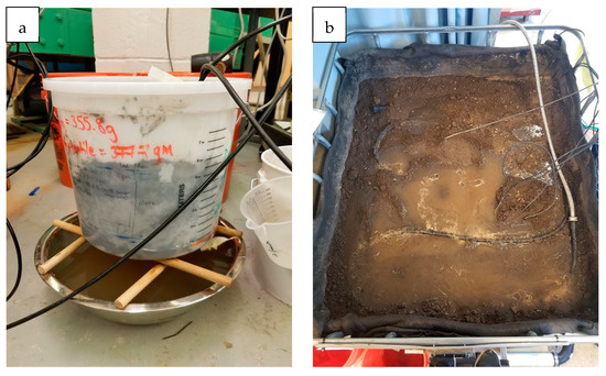 Two soil setups were prepared in the laboratory under controlled temperatures between 20 °C and 25 °C. The first setup was a bucket (23 cm in diameter) with bottom drain holes (Figure 1a) filled with a known mass of loamy sand soil 14 cm deep, with the soil moisture sensor installed at a depth of 10 cm. The primary goal of this test was to compare the volumetric moisture content from the thermogravimetric technique (TGM) and the soil moisture measurement from the default soil moisture sensor. The idea was to understand what sort of variation in soil moisture is produced due to different soil types (loamy sand) from the container versus the factory-general-calibrated (loam) sensor measurements.