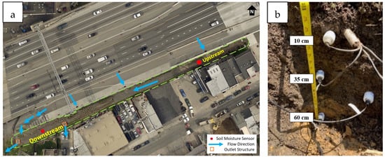 The field site used in this research is a linear bioswale [1] GSI located in Philadelphia, PA (Figure 2a). The GSI collects highway runoff, and there is 60 cm of engineered loamy sand in the bioswale to enhance infiltration. Four Stevens Hydraprobe II [29] soil moisture sensors were each used at two locations (upstream and downstream, Figure 2b) and are located at three vertical depths (10 cm, 35 cm (two sensors at this depth), and 60 cm) below the soil surface. An on-site weather station collects rainfall via a tipping bucket rain gauge [30], and all data is logged in 5-min intervals.