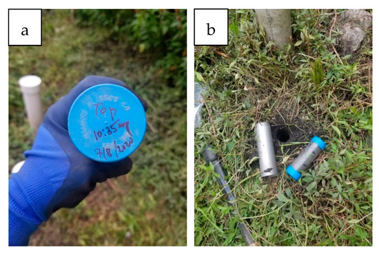 Soil sample collection from the field; (a) date and time of the sampling core, (b) collected soil core from the field.