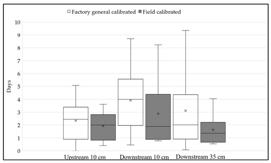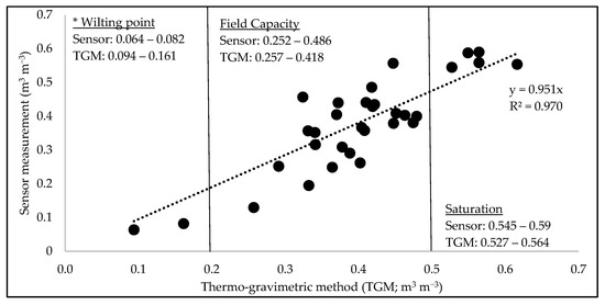 The samples taken to represent wilting point ranged from 0.06 to 0.08 m3 m−3 in the sensor but 0.09 to 0.16 m3 m−3 by established laboratory methods; as such, these ranges, though close, did not overlap. The samples taken to represent field capacity ranged from 0.25 to 0.49 m3 m−3 in the sensor and 0.25 to 0.42 m3 m−3 by established laboratory methods and had a very similar range to one another. Finally, the samples taken to represent saturation ranged from 0.55 to 0.59 m3 m−3 in the sensor and 0.53 to 0.56 m3 m−3 by established laboratory methods and had a similar range, with an overall higher range for the sensor. Overall, the factory general calibration seems to underestimate lower values of soil moisture and overestimate higher values of soil moisture. The factory default calibration of “loam” claims to be applicable to almost every mineral soil [9], but the known soil type is loamy sand, which could be partly attributable to the difference between the sensor and the thermo-gravimetrically found values.