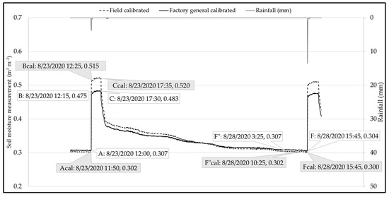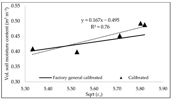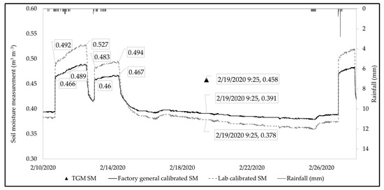 A grab sample was collected from the field site on 19 February 2020 at 9:25 am (triangle in Figure 6). The volumetric moisture content for the collected grab sample was 0.458 m3 m−3 (triangle in Figure 6), which falls at the bottom of the range for the saturated condition of the factory-general-calibrated sensor readings, although it was lower than the range for the calibrated sensor readings. Because the soil sample from the field was collected several days after the rain event occurred, theoretically the soil moisture would have been at its field capacity, i.e., the moisture value should have been less than the soil moisture at saturation; however, the grab sample value (i.e., 0.458) was higher than the soil moisture sensor measurement (Figure 6; soil moisture ~0.378). This observation demonstrates uncertainty regarding the use of laboratory-based soil-specific calibrations for field applications. Having more data samples would provide an opportunity to compare the manufacturer-based and laboratory-based calibration to determine if laboratory measurement is superior to the manufacturer’s calibration. However, field-based calibration was pursued in hopes that it would yield more certainty in in situ soil moisture readings and ongoing climatic conditions, also considering the moisture condition of the actual GSI soil.
