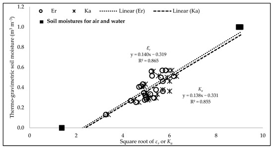 In Figure 7, the circle and asterisk represent the soil moisture calibration for the field site soil (i.e., loamy sand) with εr and Ka, respectively. In addition to the volumetric soil moisture from the gravimetric samples, the values for air and water from Table 1 (solid square dot) were also added in the graph to show the absolute minimum and maximum limits. A paired t-test showed no statistical difference between the two datasets (εr and Ka). However, the field-calibrated coefficients associated with εr are A: εr = 0.140 and B: εr = −0.319; while those associated with Ka are slightly different as A: Ka = 0.138 and B: Ka = −0.331.