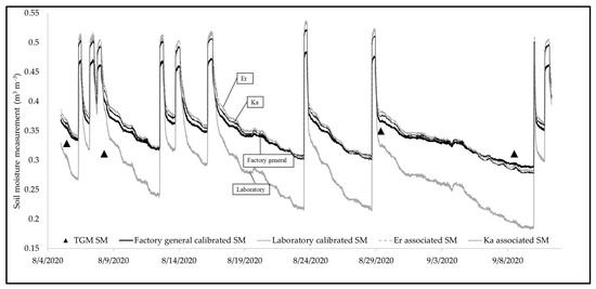 Figure 8 contains an example of the soil moisture profiles for one field site location with the following elements: (1) factory-general-calibrated equation (solid black; A = 0.109, B = −0.178), (2) laboratory-calibrated equation (solid grey; A = 0.196, B = −0.654), (3) field-calibrated equation using εr (dashed; A = 0.140, B = −0.319), and (4) field-calibrated equation using Ka (dotted; A = 0.138, B = −0.331). The triangular points represent grab sample soil moisture measurements. The soil moisture profile generated from the laboratory calibration varies distinctively from the rest. The lowest soil moisture value for a laboratory-calibrated sensor reads 0.183 m3 m−3, which is below the soil moisture at field capacity, according to the bucket test (Figure 4). The recession according to the laboratory-calibrated sensors is abrupt compared to the other three soil moisture profiles, as it varies more than others when compared to the soil moisture estimated through the thermo-gravimetric method. In contrast, the field-calibrated soil moisture measurements are closer to the factory-general-calibrated soil moisture measurements and within a reasonable range of the grab soil samples. This observation demonstrates that the laboratory calibration does not fully capture the reality of the field subsurface layer and indicates that the soil moisture from field-calibrated sensors is likely more dependable than the laboratory-based calibrations.