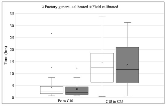 The time taken by water (desaturation time) to move from the surface to the 35 cm soil depth was noted at three different depths: 0 cm at the end of ponding (Pe), C at 10 cm (C10), and C at 35 cm (C35). In Figure 10, the average desaturation times for water to move from the Pe to C10 and C10 to C35 for the factory-general-calibrated sensors are 4.2 h and 14.6 h, respectively, while for the calibrated (using Ka field calibration) sensor, the average desaturation times are 3 h and 13.7 h, respectively. According to the calibrated sensors, the water desaturation time was faster by 1 h.