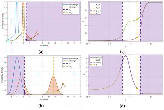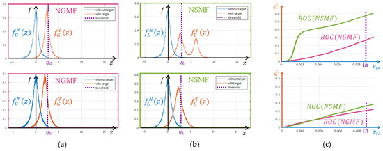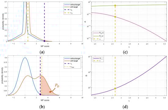where and refer to the target power and direction, respectively, and refers to one of the global or local covariance matrices. Therefore, increasing the target power () increases the expectation proportionally, shifting the “with target” distributions to the right, providing more detections (). Since this is true for any selected threshold, the performance () improves as well (see Equation (4)). Additionally, since Equation (6) holds for any kind of covariance, both the global and the local performance improve.