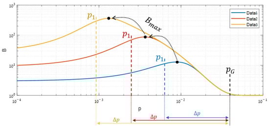 A synthetic simulation, illustrated in Figure 4, enabled characterizing the shape of . Increasing gradually from a tiny value showed that although the performance improves in both domains, a gap occurring between the global () and local () performance function causes the benefit function (), given by their ratio (Equation (5)), to become bell-shaped. Below, the origin of this gap is analyzed through the performance functions.