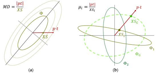 Substituting the Matched Filter expectation (Equation (6)) into definition (Equation (11)) gives a ratio between the maximal local expectation and the global expectation. However, might be better comprehended in the spectral domain where Equation (6)’s expression signifies “Mahalanobis Distance” along the target direction (), as illustrated in Figure 6a: