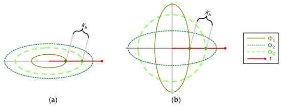 Figure 2a may represent a spectral cross-section of two segments’ covariances, their composed covariance (), and a target vector () with some power (p). As such, the illustration shows that as p increases, the Signal-to-Noise Ratio (SNR) increases relative to any covariance, whether global or local. Equation (7) shows that this increase happens proportionally regardless of the domain:
