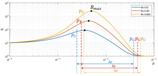 Figure 5 also shows that the maximal benefit () increases together with the efficacy range (). Their connection can be explained mathematically. At the point, is always 0.5, so the major effect on comes from (Equation (5)). Since keeps decreasing, the numerator in Equation (4) tends to zero. Numerical approximations such as Taylor’s can show that this tendency decreases proportionally to . Substituting Equation (8) and the approximation into Equation (6) gives . Compiling all together gives:
