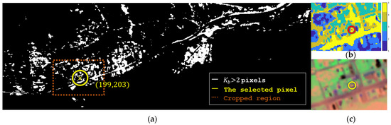 Several views with the best performing pixel, annotated “⊗”: (a) a map of all pixels, (b) the segmentation map cropped at (a)’s dashed region, and (c) a PCA-based visualization of the cropped datacube.