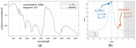 To examine the impact of different target directions in the standard RIT dataset, we started with searching for the global optimal target (). We first estimated this optimum by maximizing using Equation (13). To get a sense of how good this estimate is, we crossed the spectral space with a plane spanned by the estimated vector and ’s major eigenvector (Figure 15a). Over this plane, we rotated a target and measured and per angle.