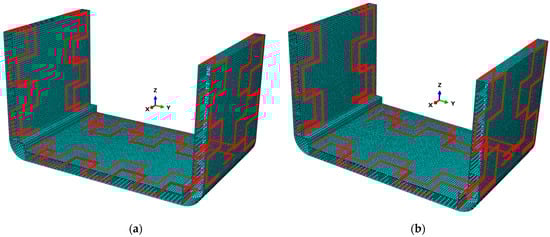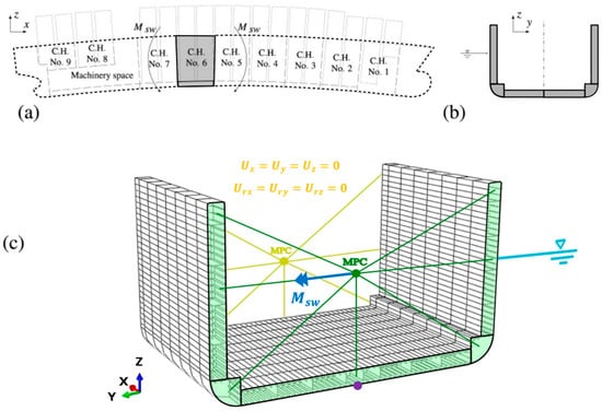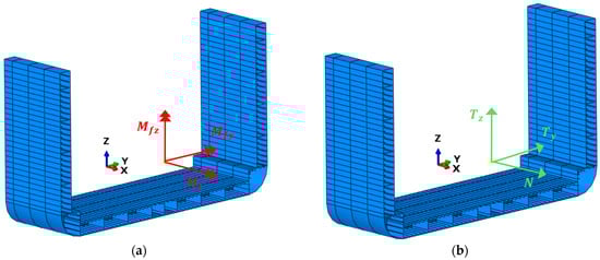 The choice of boundary and loading conditions is described as follows. The BCs were inspired by those considered in [34,36], which specify that the planes at the ends (fore and aft) of the FEM portion model must remain flat under the action of the bending moment, while these cross-sections must be able to rotate freely (in the case of longitudinal resistance only). For this purpose, all nodes associated with the continuous longitudinal stiffeners at the two ends of the model must be rigidly connected to an independent point. The independent point was placed along the centerline at a height close to the position of the neutral axis (at the coordinate ). These independent points are connected to the model by rigid links through the usage of a multipoint constraint (MPC, type “beam” in ABAQUS CAE) and can only rotate freely along the y-axis, where the longitudinal vertical bending moment , the unique bending action considered for simplicity, is applied.