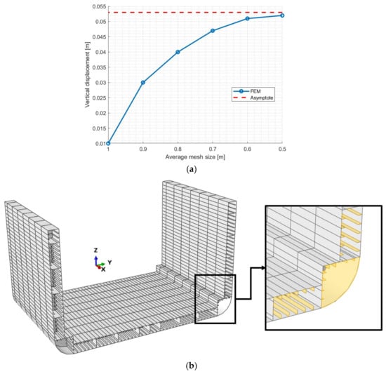 The model is composed of 45,060 4-node quadrilateral shell elements with full integration [15,29]. The average mesh size of the numerical model is 500 mm, while no refinement strategy has been adopted. The mesh size was determined after performing a mesh convergence process to ensure that the displacements in the most important locations are accurately captured. Just as an example, Figure 5a shows the direct FEM convergence chart for the vertical displacement profile of the violet point in Figure 4c. Aside from that, the computational cost associated with the analyses was considered.