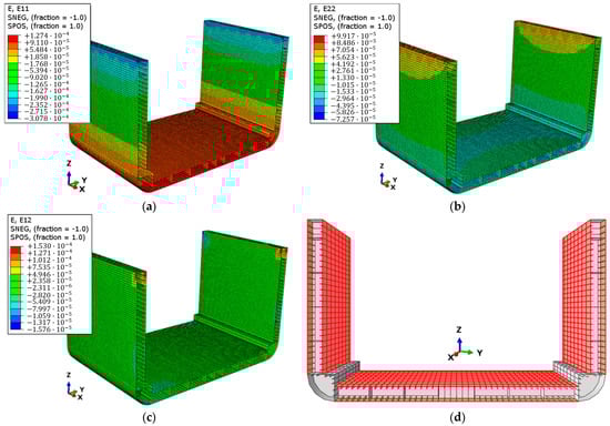 Direct model FEA results: (a) E11, normal strain field along x-direction, (b) E22, normal strain field along y-direction, (c) E12, shear strain field on x, y-plane. (d) Indication of sensor-applicable surfaces.