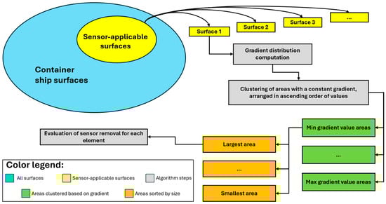 Creating a high-performance sensor network requires the use of specific techniques or algorithms, especially for complex and intricate cases like a containership. Among the existing families of algorithms, genetic algorithms are a valid choice for ship sensorization due to their versatility and general applicability. Their functioning principle involves the iterative and random generation of new solutions, based on those from the previous generation, until an effective population of solutions is obtained [43,44]. However, genetic algorithms tend to be slow and computationally expensive. As an alternative, this paper proposes a simple deterministic algorithm, based on the gradient analysis of strains (gradient algorithm). The principle of the gradient algorithm is to identify areas of the structure characterized by a minimal and/or constant strain gradient, to assess the possibility of not placing sensors in such zones. This is because areas with low or constant strain gradients, respectively, show minimal variation and a more linear trend in the values, making them easier to interpolate accurately. As a result, the gradient algorithm provides the locations of the centroids for the minimum number of elements in the inverse model that require the presence of a sensor to ensure accurate extrapolation and reconstruction of the strain field. These locations are ultimately used as a reference for proposing a sensor network pattern to be parametrized (further details in Section 5).