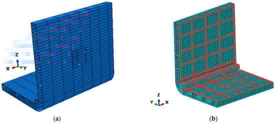 The remaining aspects to be defined include the material, boundary, and loading conditions. Regarding the material, typical naval mild steel properties are used, namely , Poisson’s ratio , and density [39,40].