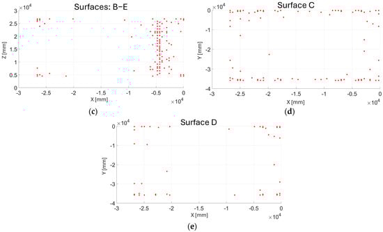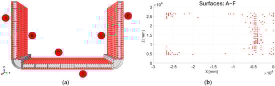- Identify the sensor-applicable surfaces: Among all surfaces of the structure, the ones deemed suitable for sensor placement are the inner faces of the three bulkheads highlighted in Figure 6d. These surfaces, being the largest, allow for an interconnected fiber network to be applied, offering extensive coverage of the ship’s critical areas. The remaining surfaces were excluded for logistical and operational reasons, including exposure to seawater, the presence of cargo constraints, and the practicality of installing an interconnected fiber network on a single plane, thereby avoiding installation on transverse structural elements.