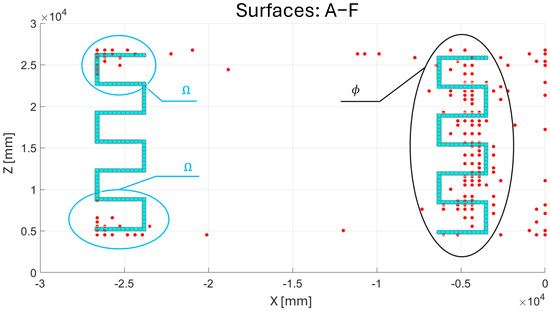 - Evaluation of sensor removal: The final step in the gradient algorithm involves identifying surface locations where a sensor is not required. The principle behind this step is to evaluate the removal of one sensor at a time on each element of the sensor-applicable surfaces, following a specific sequence of analysis and separately for each surface. To represent the removal of a sensor from the surface, it is assumed that the corresponding value is absent from the distribution. Subsequently, the missing data are interpolated using polynomial functions. The accuracy of the resulting new distribution is assessed against the original values by calculating the maximum relative error and root mean square error , as defined in Equations (13) and (14). Both parameters must be lower than their respective acceptance thresholds, and , in order for the removed sensor to be considered non-essential for interpolating the field . The threshold values, and , are estimated through an iterative process that involves repeated applications of the gradient algorithm, aimed at optimizing the filtering of sensor locations. Assigning threshold values that are too low could compromise the collection of an adequate number of relevant locations, while high values could limit the effectiveness of the filtering by including unnecessary locations. The optimal values of and are provided in Table 2.