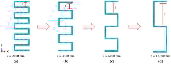 As a result of the optimization procedure, the optimal configuration of the proposed FOP, identified with index 16 in Table 7, is characterized by an value of 8000 mm and a value of 6.57 and is illustrated in Figure 14b.