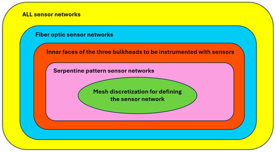 Another reason for this undefined trend is the limited set of configurations analyzed. In general, there are countless options for the sensor network to be implemented on the containership for SHM, but only a subset has been evaluated. As illustrated in Figure 17, the set of all possible sensor networks is progressively narrowed based on the specific characteristics of the case under consideration: