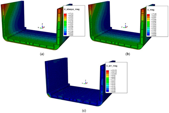 Comparison of displacement fields: (a) U_abaqus_mag: magnitude displacement field of direct model’s FEA results (in mm); (b) U_mag: magnitude displacement field reconstructed by iFEM (in mm); (c) U_err_mag: percentage difference between fields (a,b).