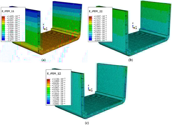 iFEM reconstructed strain fields: (a) E_iFEM_11, normal strain field along x-direction; (b) E_iFEM_22, normal strain field along y-direction; (c) E_iFEM_12, shear strain field on x, y-plane.
