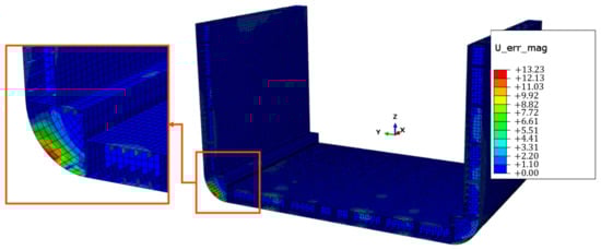 The results in Figure 18 demonstrate how the sensor network shown in Figure 14b enables an accurate reconstruction of the displacement field, with the error distribution in Figure 18c estimated as the percentage difference between the magnitude displacement field from the iFEM reconstruction and the FEA results of the direct model. It can be observed that the error distribution in the magnitude displacement field shows very low values, below 2%, except for the peak zones highlighted in Figure 20, where the error rises to 13.23%. It is important to note that Figure 20 shows a close-up of a portion of the model, but this observation also applies to the symmetrically opposite surfaces relative to the - plane.