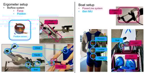 Rowing is a sport that requires the precise coordination of all the body segments, making technique a determinant factor for performance, with the result of a race possibly being decided by differences as small as a fraction of a second [1,2]. Rowing involves cyclic movements, and each cycle is usually decomposed into two phases, namely, the drive and recovery phases. The ‘drive’ phase begins when the oars are inserted into the water; this event is called the ‘catch.’ During the drive, the oars remain immersed in the water and propel the boat forward [1]. During this phase, the sequential movement of the legs, trunk, and arms generates power that is ultimately transferred to the water through the oars [1]. At the end of this movement, the oars are extracted from the water, marking the event called ‘finish’ and the beginning of the ‘recovery’ phase. During this phase, the oars remain out of the water, and the rowers pull the boats with their feet in order to prepare for the following cycle. When weather conditions are unsuitable for rowing on water, rowers often train indoors using rowing ergometers [3]. Some ergometers have been designed to reproduce as closely as possible the forces and movements of boat rowing by including a free-floating mechanism that allows the frame of the ergometer to slide in the horizontal direction [3].