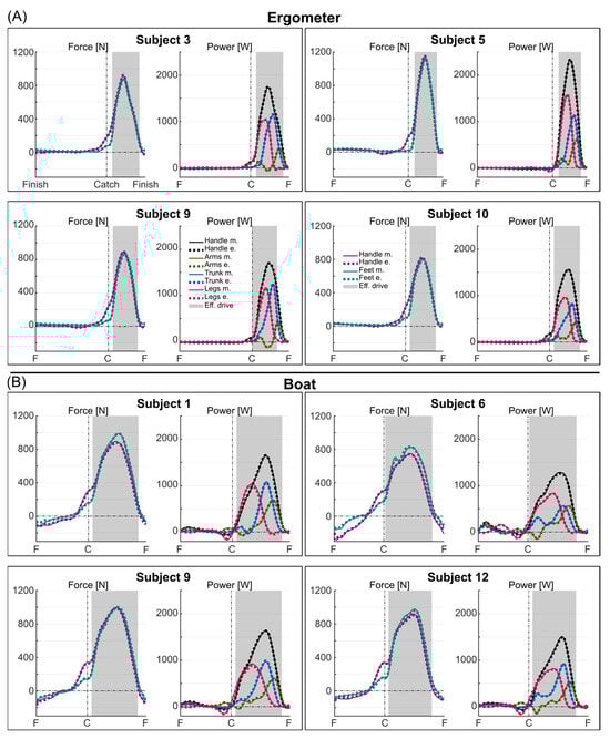 Measured (continuous lines) and estimated (dashed lines) force and power profiles for four representative subjects during ergometer (A) and boat (B) rowing. The curves represent the average over the cycles used for validation, time normalized over the finish-to-finish period. The vertical line defines the catch event; the shaded area defines the effective drive phase.