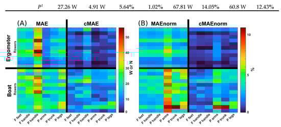 MAE and cMAE are reported in absolute values (A) and normalized to the average value of the target curve (B). Units are N for the forces (F) and W for the powers (P). Rows correspond to individual rowers.