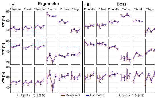 Technical determinants T2P, M2P, and WR were computed on the measured (red) and reconstructed (blue) forces and power sequences for four representative subjects in ergometer (A) and boat (B) rowing sessions. Mean and standard deviation were calculated across all cycles in the validation dataset.