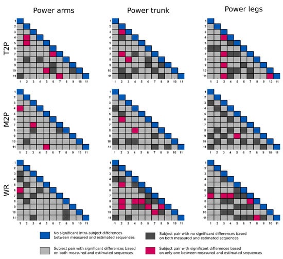 Two-sample t-test results between the measured and LSTM-estimated sequences for the T2P, M2P, and WR derived from the power arms, trunk, and legs. Values along the diagonal represent the intra-subject differences between measured and reconstructed sequences. Values outside the diagonal are comparisons between pairs of subjects performed on both the measured and estimated sequences. The colors indicate whether the inter-subject differences detected from the estimated sequences are consistent with those detected from the measured sequences.