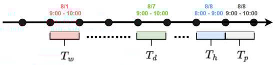 The daily-periodic segment comprises historical traffic data from the corresponding hours of previous days. These data are used to identify recurring daily patterns in traffic flow, where s is the sampling frequency per day. As illustrated in Figure 2, the daily segment is visually represented by the green portion of the timeline and is defined as follows:
