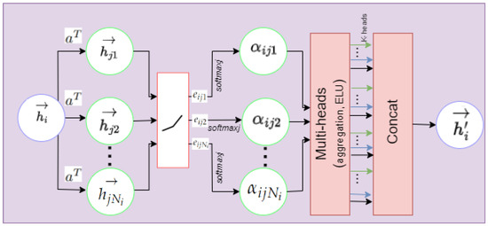 where a specifies the function used to compute the attention score, is the transposition, represents the weight matrix for all sensor nodes, || signifies the concatenation operation, and denotes the non-linear activation function to filter out less significant relationships. The attention coefficient is obtained by normalizing the attention score for all the neighboring sensor nodes j relative to sensor node i as follows:
