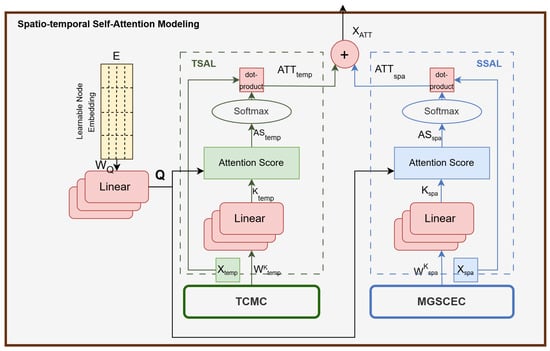 Spatio-temporal data exhibit variability across both the spatial and temporal dimensions. To adaptively capture these variations, STSAM is introduced as illustrated in Figure 6. STSAM comprises two distinct layers: a Temporal Self-Attention Layer and a Spatial Self-Attention Layer. Initially, a learnable node embedding dictionary, , is employed to demonstrate the characteristics of an arbitrary node v in a high-dimensional space. Notably, the same node embedding E is utilized in MGSCM to ensure a consistent high-dimensional representation of nodes throughout the model, thereby reducing the number of parameters. Subsequently, a node-level self-attention mechanism is applied.