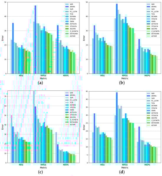 To comprehensively evaluate the predictive capabilities of the ASTAM, its predictions on the test set were compared with the actual traffic values through visualization. The visualization reveals that the prediction results show similar flow and trends compared to the actual traffic volumes during the predicted times, as shown in Figure 13. Even under challenging traffic conditions, the ASTAM delivered accurate predictions that corresponded closely to actual traffic volumes and effectively captured changes during significant traffic fluctuations, as demonstrated in Figure 13b. This confirms the ASTAM’s ability to effectively represent global traffic flow variations and capture diverse dependency features. Overall, the consistently strong performance of the ASTAM across various datasets underscores its reliability and robustness.