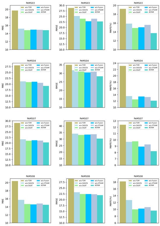Furthermore, the SAGCN and DGAT within the MGSCM component each offer distinct advantages that can contribute to more accurate predictions. Notably, the SAGCN appears to have a greater impact than the DGAT. The fusion of these components positively influences the predictive performance of the ASTAM. The ASTAM achieved improvement in MAE when compared with (w/o Fusion) by 1.14%, 9.3%, 4.9%, and 0.68% for PeMS03, PeMS04, PeMS07, and PeMS08, respectively.