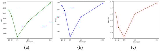 Effect of the various embedding dimensions on (a) MAE, (b) RMSE, and (c) MAPE.