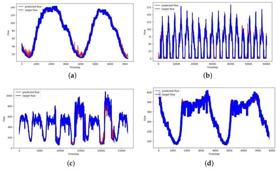 Traffic flow prediction result visualization of (a) PeMS03, (b) PeMS04, (c) PeMS07, and (d) PeMS08.