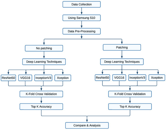 Figure 1 shows the methodological process followed for this study. To predict MSC, first, data were collected using a smartphone and pre-processed images before using them for deep learning models, and were named as the primary dataset. The primary and patched datasets were analysed in two categories: (1) Page/Hue-level prediction, and (2) chip-level prediction. The analysis has also determined which deep learning technique is working best for the primary dataset. For analysis, the test accuracy and Top 5 test accuracy were calculated for both patched and primary data using all four deep learning techniques and 10-fold cross-validation. Test accuracy gives the percentage of positive prediction, and the Top 5 accuracy provides information about finding the exact match on the first 5 predictions. As some colour chips are almost identical to each other, agreement with any of the Top 5 predictions will also be accepted. The standard deviation, precision, recall and f1 score were also analysed to determine the best method for MSC prediction. These attributes compare the prediction with test references and ensure which method performs better.