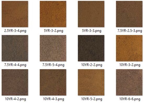 To demonstrate the application of the proposed method in a real-world soil scenario, some soil samples were collected during the National Soil Judging Competition 2023 [50]. Naturally, soils does not have a uniform colour as the MSCB. It contains shadow, texture, dirt, etc. After data collection, the dry soils were then sieved to obtain fine granules to minimize structures and shadows. After that, the same smartphone was used to take pictures of the 12 soils under a constant light condition. Each image was cropped using Photoshop to 600 px/600 px to avoid redundant characters in the images. Figure 4 shows the cropped images of the soil samples. The colours of these 12 samples were determined by a soil scientist, and the colours are: 7.5YR-2.5-3, 5YR-3-3. 2.5YR-3-4, 5YR-3-2, 10YR-4-2, 10YR-4-3, 10YR-5-2, 10YR-3-2, 10YR-2-2, 10YR-6-6, 7.5YR-4-4, and 7.5YR-5-4. Not all of the Hues are prominent in Australia. A study by [51] showed that the 7 most common Hues that are present in Australian top soils are 5Y, 2.5Y, 10YR, 7.5YR, 5YR, 2.5YR, and 10R. For this study, to demonstrate the proposed method, a small number of soil colours were analysed with a constraint experiment to represent real soil. The analysis with real soil will be sturdy when more soil with variation in colour will be collected.