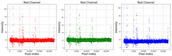 Pixel intensity of GLEY1-2.5-5GY colour chip (150 px/150 px) for RGB colour channel. The intensity of R, G and B channels is not constant in all pixel indexes. The x-axis represents the index of the pixel in the array of pixel values. The y-axis represents the intensity values of the pixel for each respective colour channel (red, green, blue).